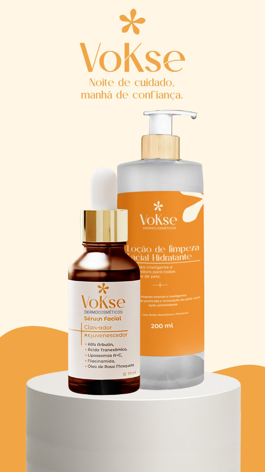 VOKSE é um tratamento completo com Alfa Arbutin, Ácido Tranexâmico, Lipossomas de Vitaminas A+C, Niacinamida, Óleo de Rosa Mosqueta, Pantenol e Vitamina E.